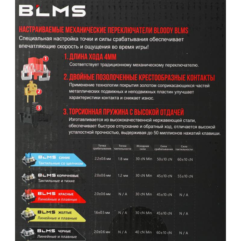 - Новые механические свитчи Bloody Mechanical Switches. Мультимедийные горячие клавиши: есть, 12 (FN+). Подсветка может быть перепрограмирована до RGB (скачать фирменное ПО с офиц сайта bloody)
