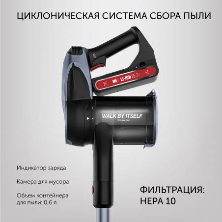 - Циклоническая система сбора пыли. Технология WALK by ITSELF - чисто без усилий. Благодаря особому электроприводу на щетке пылесос сам устремляется вперед, его вес практически не ощущается при использовании на горизонтальных поверхностях. 4 режима работы