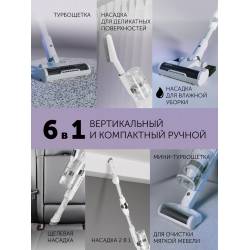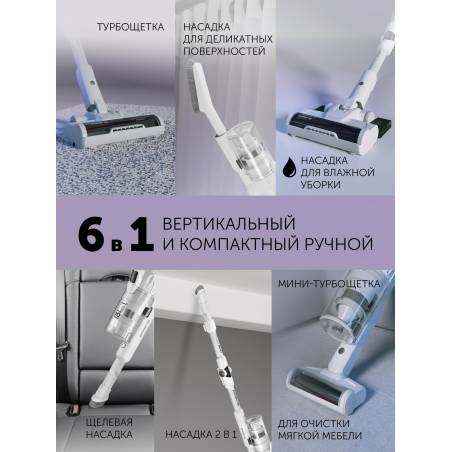 - мини турбощетка; насадка 2 в 1; щелевая насадка; насадка для влажной уборки; насадка для люстр, полированных и деликатных поверхностей