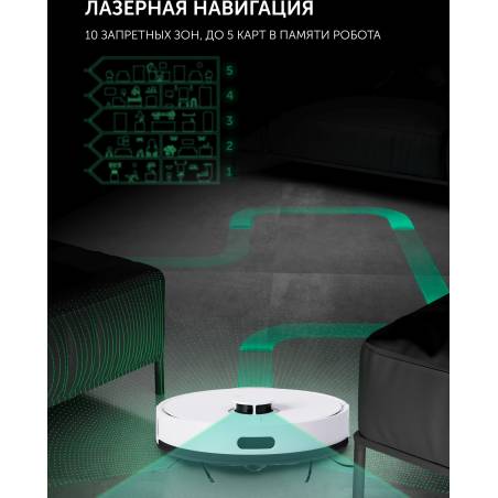- Высокоточная система лазерной навигации для построения карты помещения, сохраняет до 3 карт; Разделение на зоны уборки – до 10 комнат; Ограничение зоны уборки - до 10 зон в каждой комнате; Возобновление уборки с точки остановки после подзарядки; Расписани