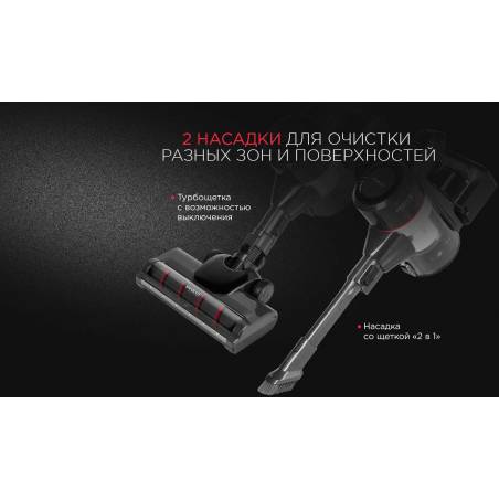 - Трубка-удлинитель, аккумулятор, турбощетка, насадка со щеткой «2 в 1», адаптер питания, крепление, комплект крепежных элементов