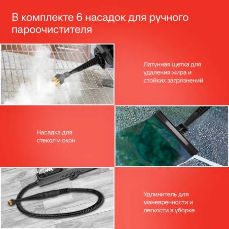 - насадка для влажной уборки ковров/полов, насадка для влажной уборки мягкой мебели, насадка для мытья окон, насадка для мягкой мебели, насадка для пола и ковров, щелевая насадка