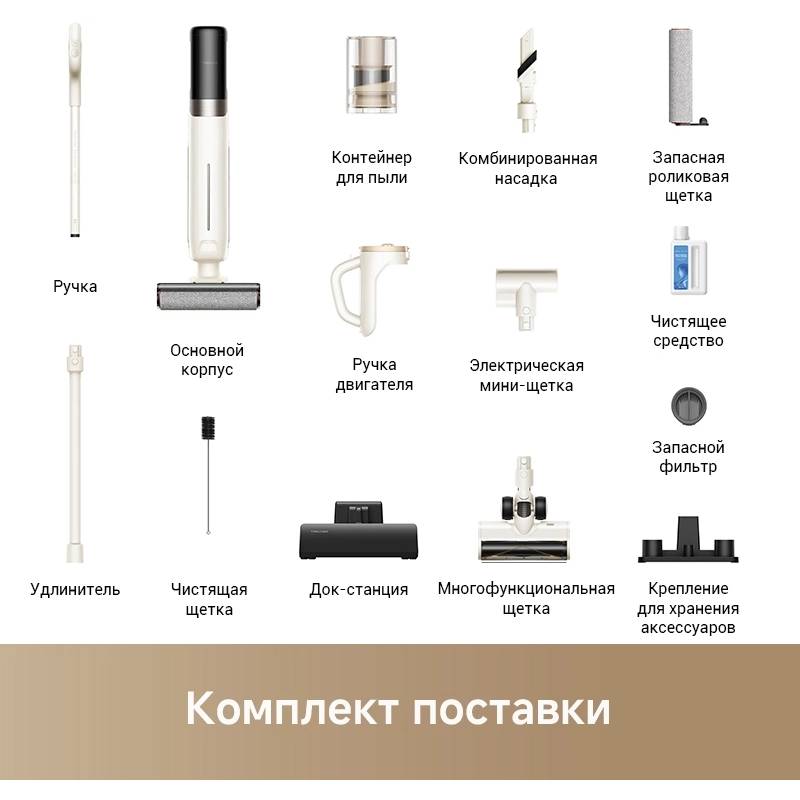 - Чистящая щетка, Запасная роликовая щетка, Сменный фильтр, Хранилище аксессуаров