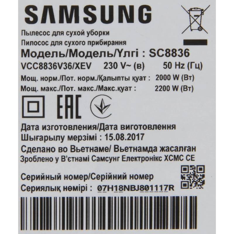 Пылесос Samsung VCC8836V36/XEV 2200Вт синий/черный