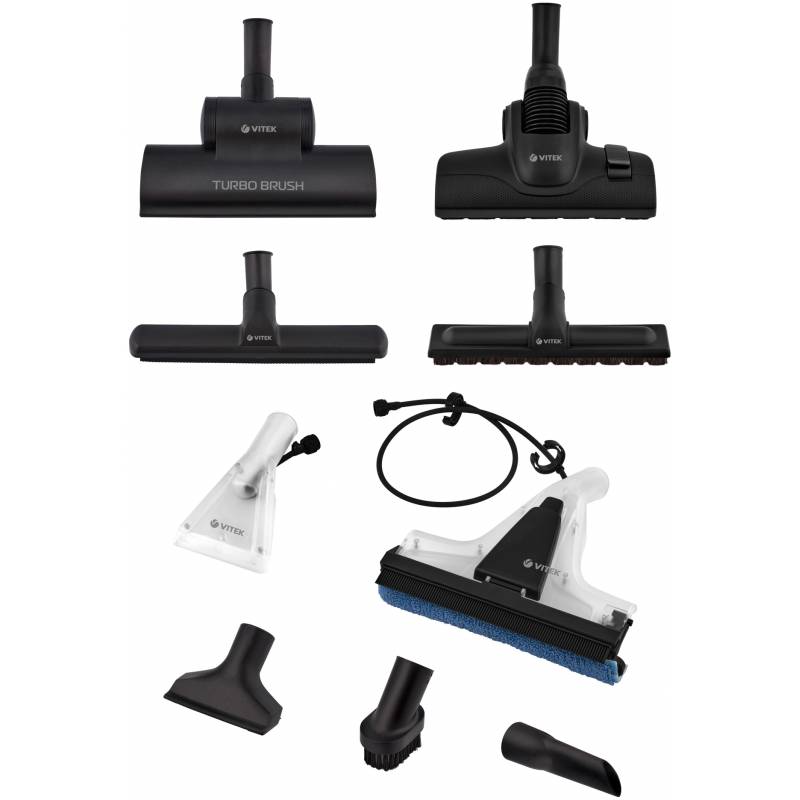 - насадка для мытья окон, насадка для мягкой мебели, насадка для пола и ковров, турбощетка, щелевая насадка