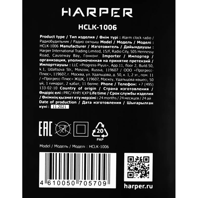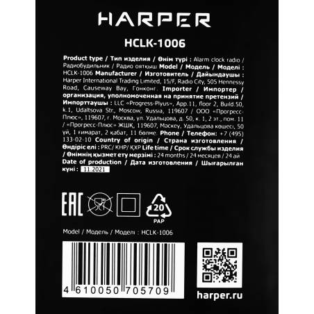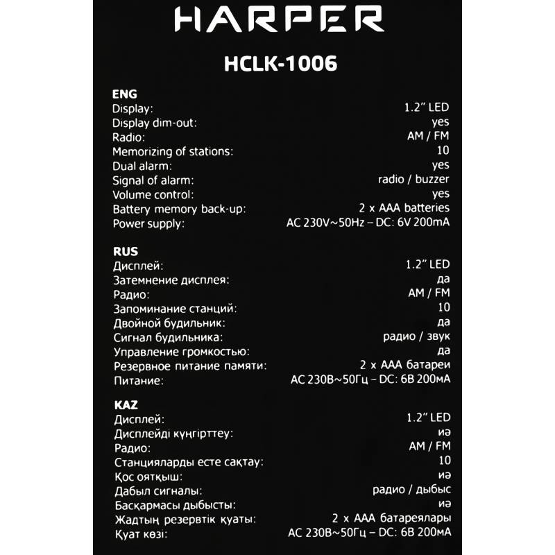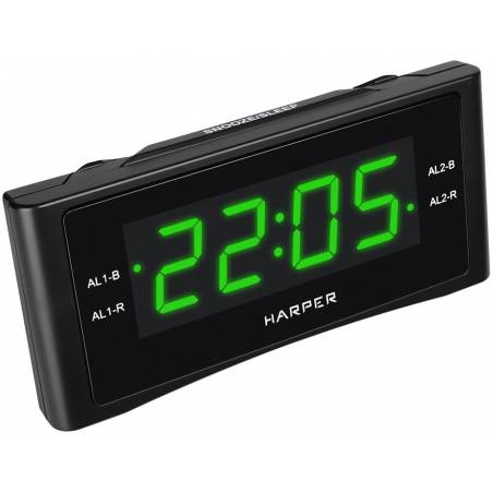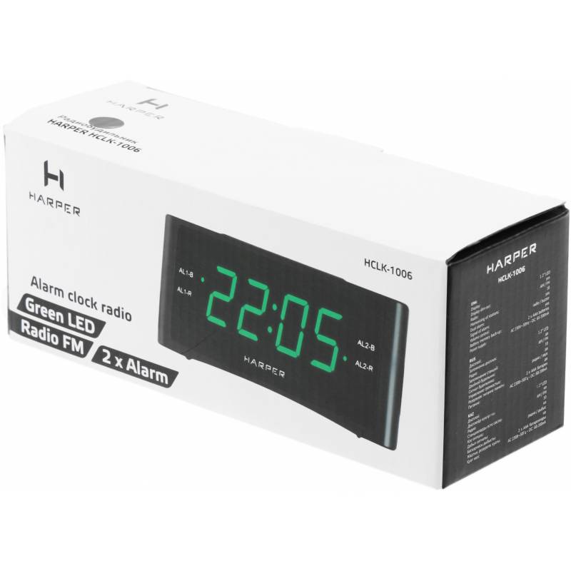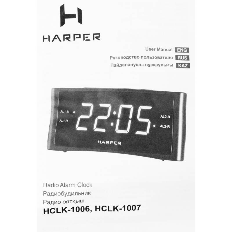 - Два независимых будильника. Удобный ночник с гибко регулируемой подсветкой . Если вы любите засыпать под звуки радио, у Harper HCLK-1006 есть функция автоотключения (от 10 до 90 минут). В памяти можно сохранить до 20 каналов, любой из них можно выбрать вм