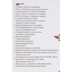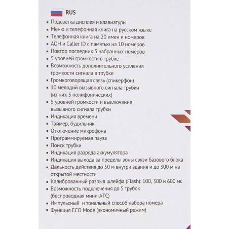 - поиск трубки, программируемая пауза, отключение микрофона, экономичный режим, индикация выхода за пределы зоны связи базового блока, индикация разряда аккумулятора