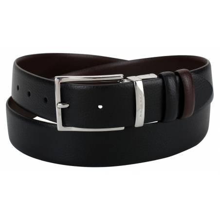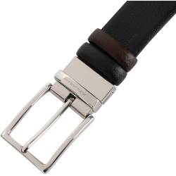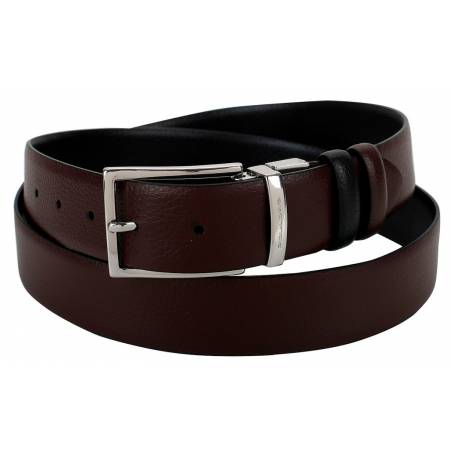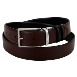 - Элегантный классический ремень идеально подойдет в качестве дополнения к официальному деловому костюму. Двусторонний аксессуар изготовлен из коричневой и черной натуральной кожи с зернистой фактурой. Ремень дополнен традиционной открытой пряжкой из светло