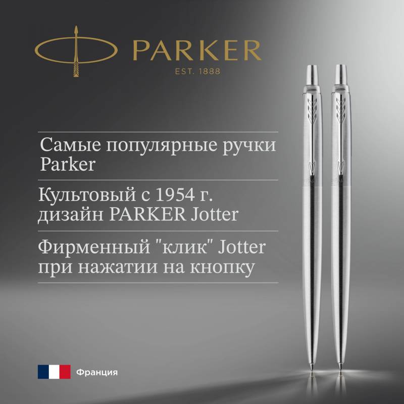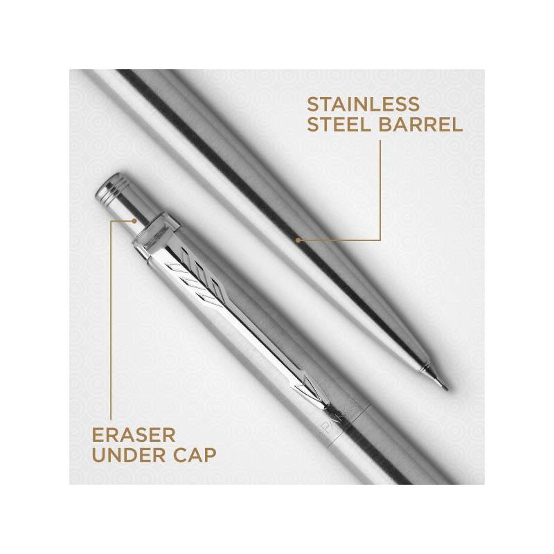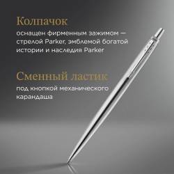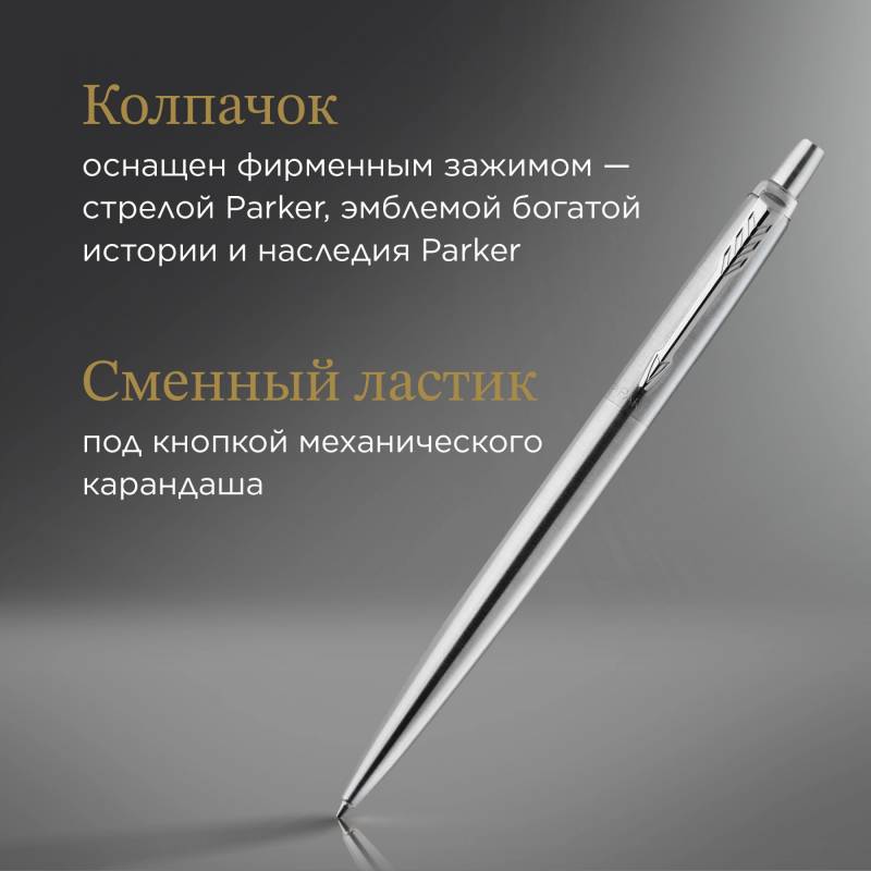 - Улучшенная модель культовой шариковой ручки Parker Jotter.Высоконадежный кнопочный механизм выдвижения грифеля.Используются стандартные грифели HB 0,5 мм Parker для механических карандашей с непрерывной подачей грифеля.Встроенный сменный ластик, находится