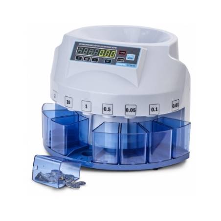 - Автоматоматичкеская остановка сортировки при опустошении загрузочного бункера и при достижении лимита фасовки всех приемных лотков. Просмотр на дисплее общей суммы, количества просчитанных монет и детализация по каждому номиналу.