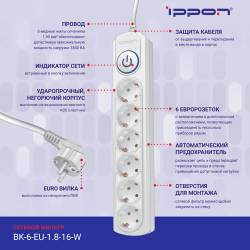 Сетевой фильтр Ippon BK-6-EU-1.8-16-W 1.8м (6 розеток) белый (коробка)