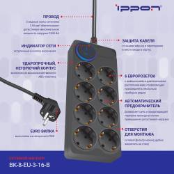 Сетевой фильтр Ippon BK-8-EU-3-16-B 3м (8 розеток) черный (коробка)