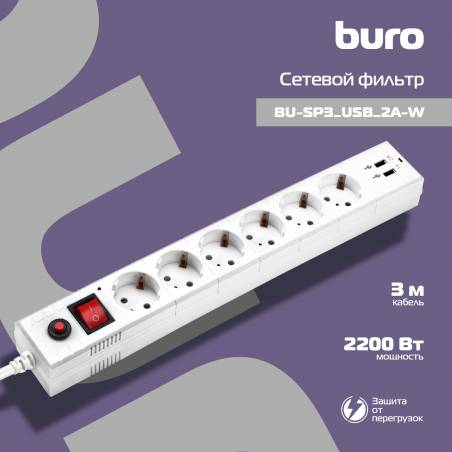 Сетевой фильтр Buro BU-SP3_USB_2A-W 3м (6 розеток) белый (коробка)