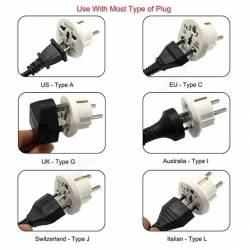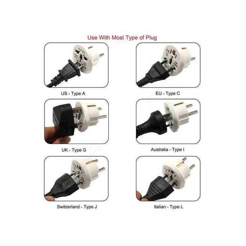 - Для вилок: US - Type A, EU - Type C, UK - Type G, Australia - Type I, Switzerland - Type J, Italian - Type L.
