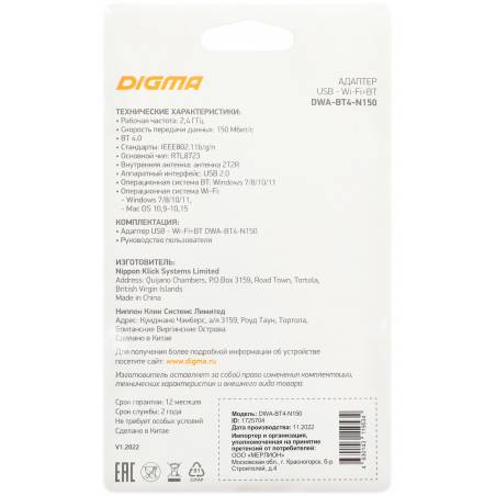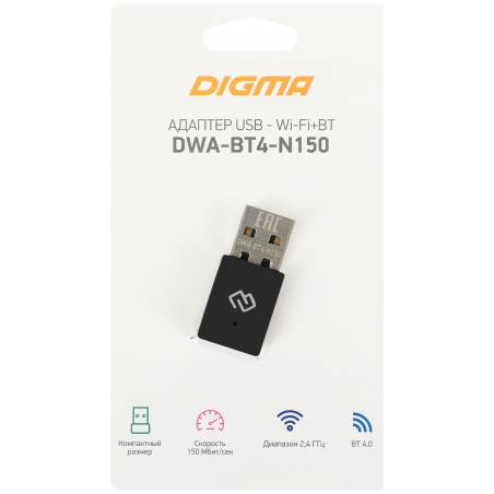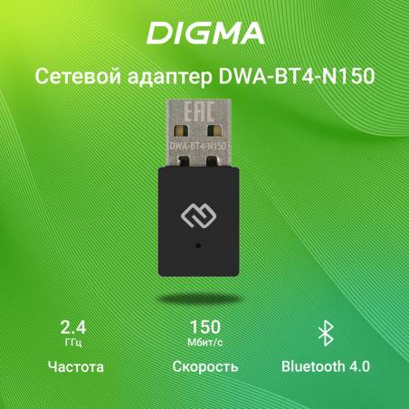 Сетевой адаптер Wi-Fi + Bluetooth Digma DWA-BT4-N150 N150 USB 2.0 (ант.внутр.) 1ант.