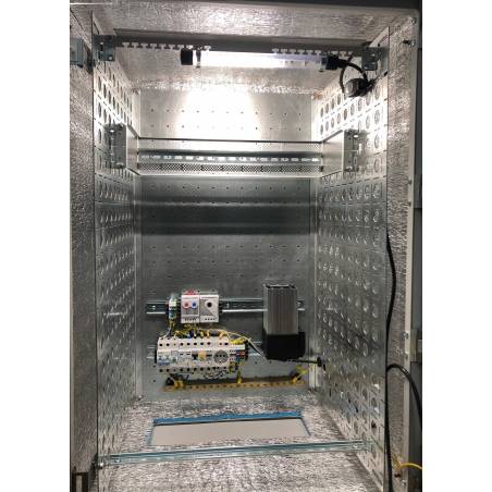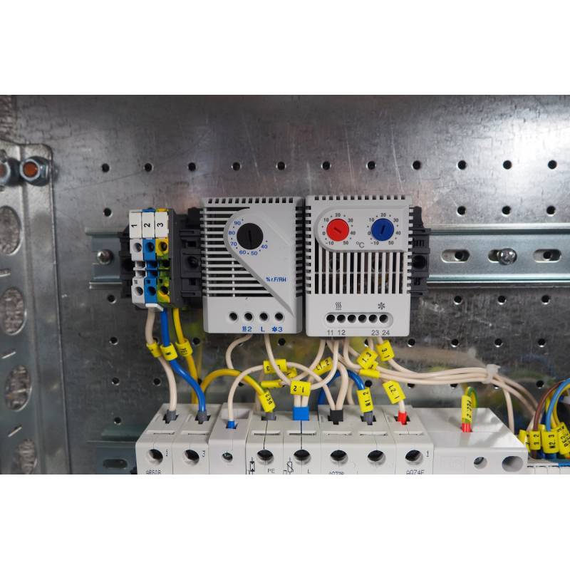 - ВРУ, терморегулятор, гигростат (35-95%), нагреватель, модуль вентиляторный R-FAN, система климат-контроля CE, переключатель кнопочный 250 В/0,25 А - 1 шт., шина заземления, клеммы с винтовым зажимом 6 кв.мм. - 4 шт.