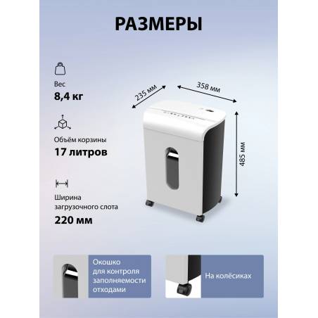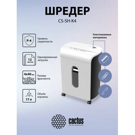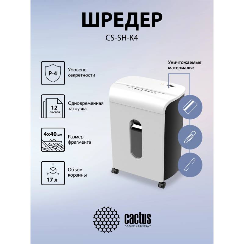 Шредер Cactus CS-SH-K4 белый/черный (секр.P-4) фрагменты 12лист. 17лтр. скрепки скобы пл.карты