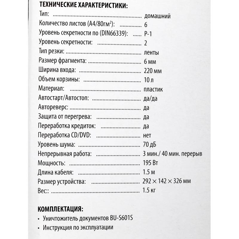 Шредер Buro Home BU-S601S (секр.Р-1) ленты 6лист. 10лтр. пл.карты