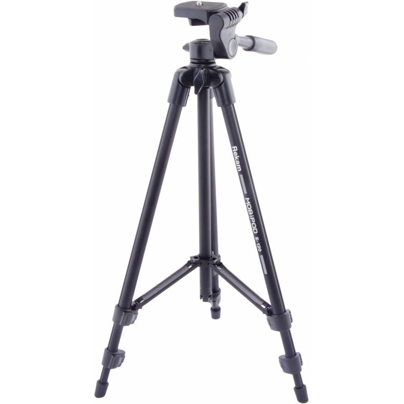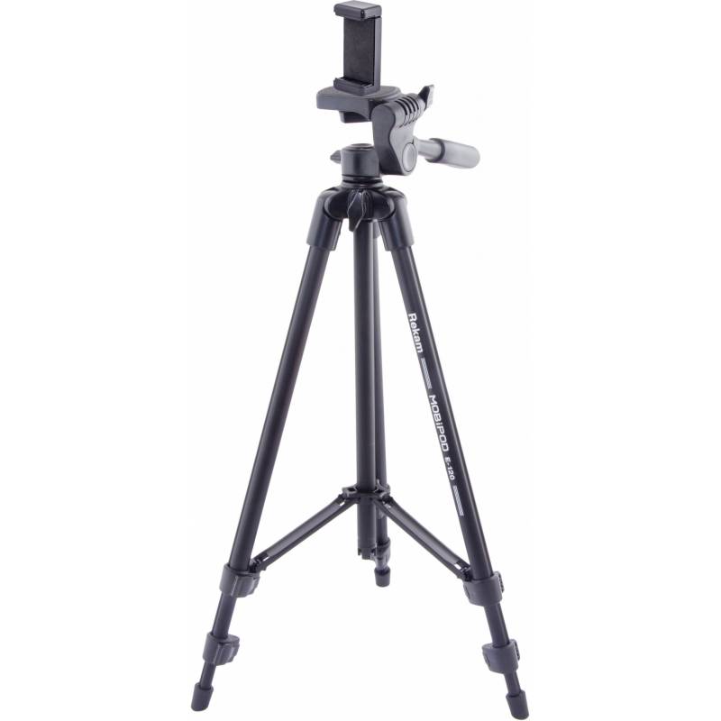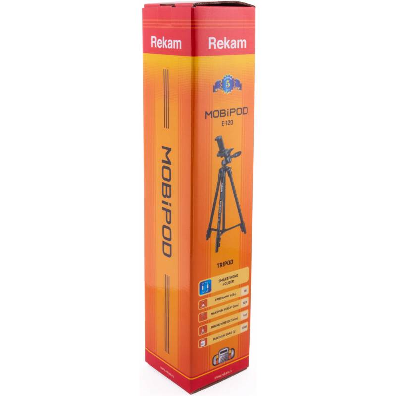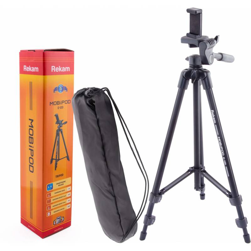 - Rekam MOBIPOD E-120 – небольшой универсальный 3-секционный штатив укомплектованный высококачественным держателем для смартфонов экраном до 6,5 дюймов .Предназначен для путешествий ,выездных съемок а также любительской студийной, макро и каталожной съе