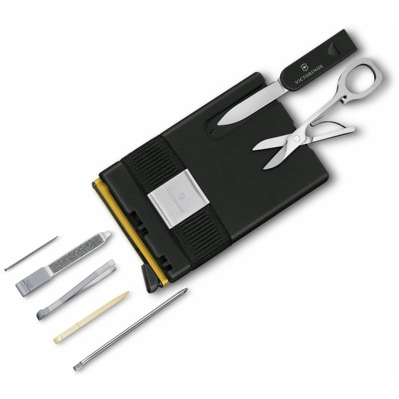 - 1. Кардхолдер2. Резинка для наличных денег3. Маленькое лезвие4. Ножницы5. Пилочка для ногтей6. Отвертка 2.5 мм7. Пинцет8. Зубочистка9. Булавка10. Шариковая ручка