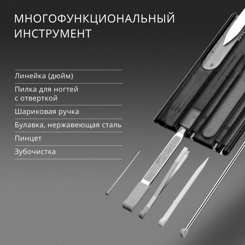 - Швейцарская карта SwissCard - это многофункциональный инструмент с набором из 10 функций:Нож для писемНожницыБулавка, нержавеющая стальПилка для ногтей с:- ОтверткойПинцетЗубочисткаШариковая ручкаЛинейка (см)Линейка (дюйм)