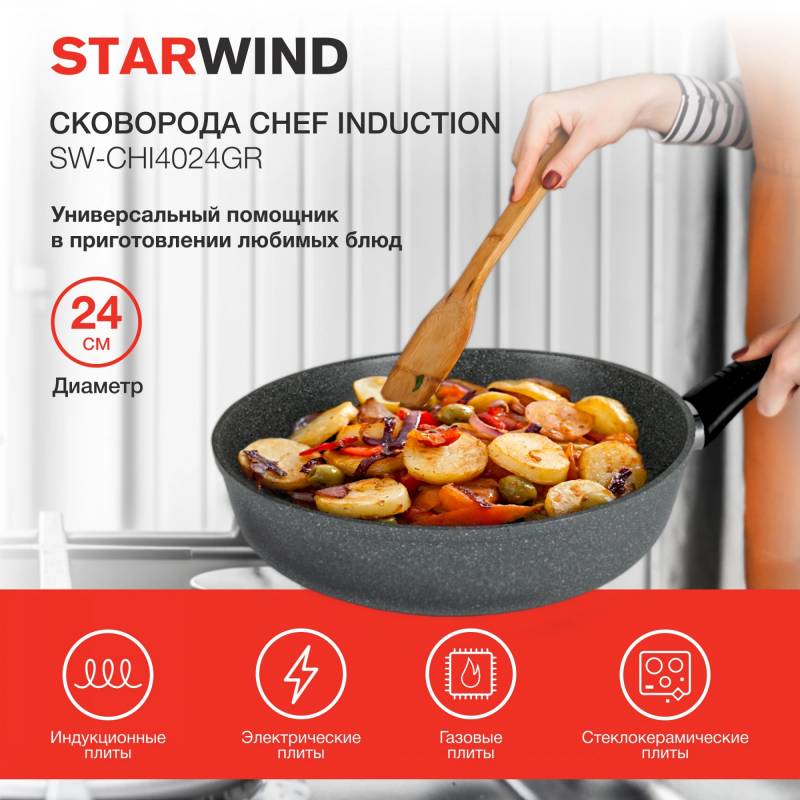 Сковорода Starwind Chef Induction SW-CHI4024GR круглая 24см покрытие: Pfluon ручка несъемная (без крышки) серый