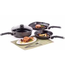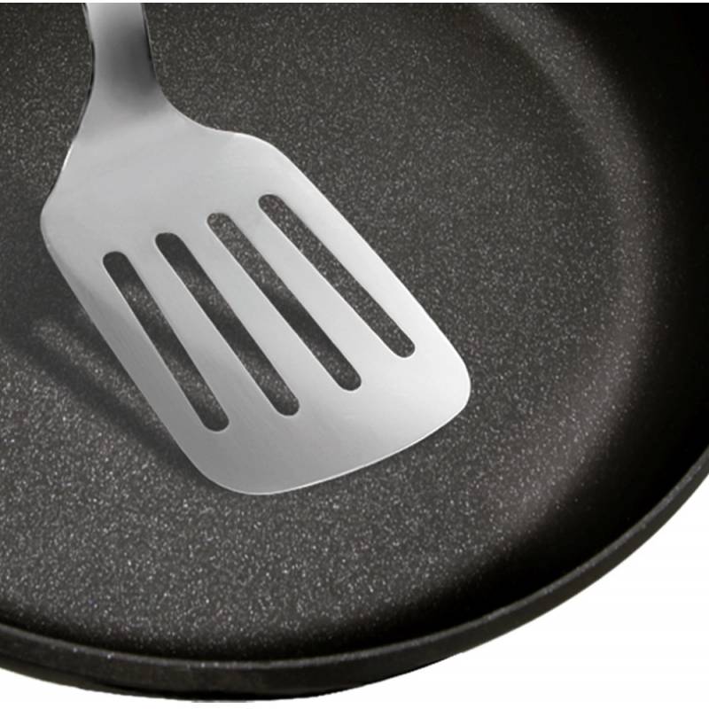 - Аксессуары: из бакелита, с покрытием Soft Touch. Преимущества: Цельный индукционный диск; Уникальный внешний декор поверхности сковороды - стилизация под кожу земноводных; Удобный хват; Возможно использование металлических лопаток. Упаковка: п