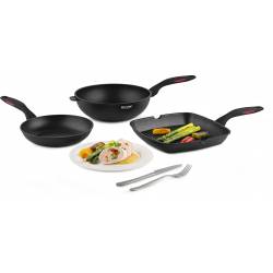 - Аксессуары: эргономичные бакелитовые ручки с soft touch покрытием и силиконовыми вставками, препятствующими скольжению. Преимущества: специальное внешнее термостойкое покрытие для легкого ухода; Xylan® Plus – двухслойное, долговечное антипригарное