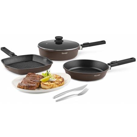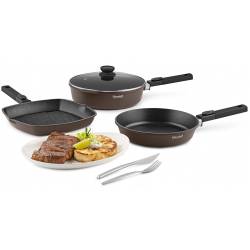 - Аксессуары: эргономичные бакелитовые ручки с soft touch покрытием и силиконовыми вставками, препятствующими скольжению. Преимущества: специальное внешнее термостойкое покрытие для легкого ухода; Xylan® Plus – двухслойное, долговечное антипригарное