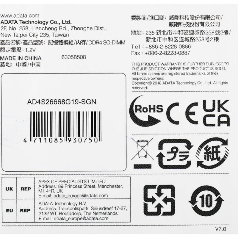 Память DDR4 8Gb 2666MHz A-Data AD4S26668G19-SGN RTL PC4-21300 CL19 SO-DIMM 260-pin 1.2В dual rank Ret