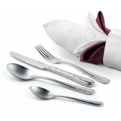 - Преимущество: оригинальный текстура в стиле чеканки на всей поверхности ручек, зеркальная полировка. Материал: приборы сделаны из стали 18/0, не вступают в реакцию с компонентами пищи; толщина стали 2,5 мм. Использование: не подходит для ПММ.