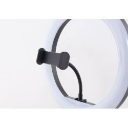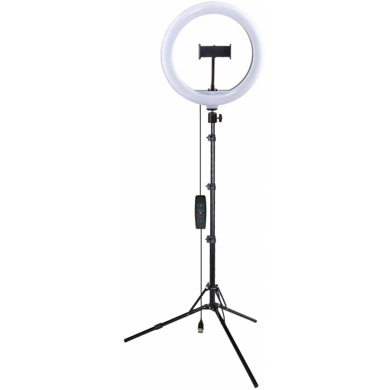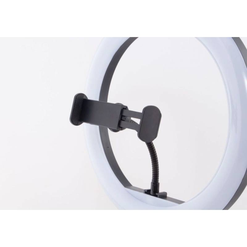- Кольцевая светодиодная лампа. Шнур питания с пультом и USB-разъёмом. Держатель для смартфона. Гибкое шарнирное крепление (Goose neck). Крепление на стойку (штатив) с интегрированной шаровой головой. Винт регулировки угла наклона лампы. Студийная стойка (д