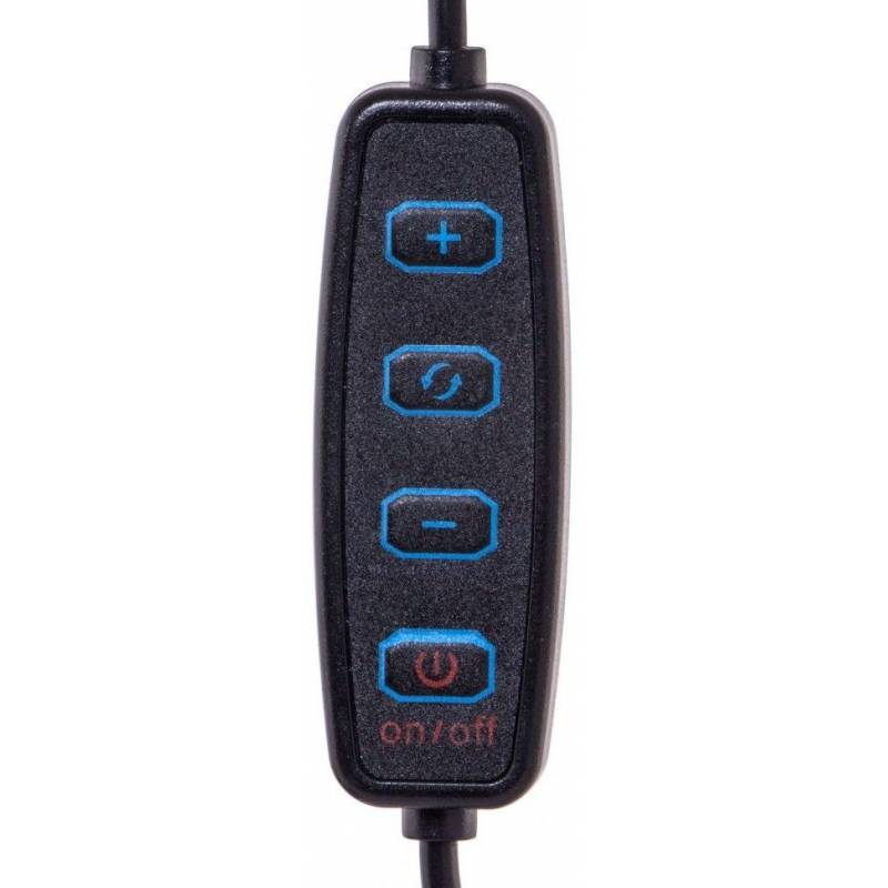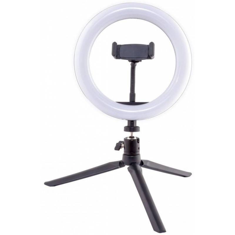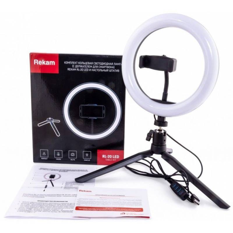 - Кольцевая светодиодная лампа. Шнур питания с пультом и USB-разъёмом. Держатель для смартфона. Гибкое шарнирное крепление (Goose neck). Крепление на стойку (штатив) с интегрированной шаровой головой. Винт регулировки угла наклона лампы. Настольный штатив в