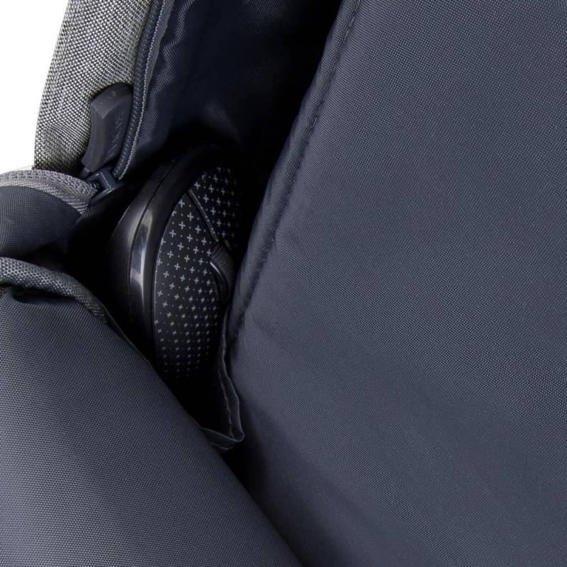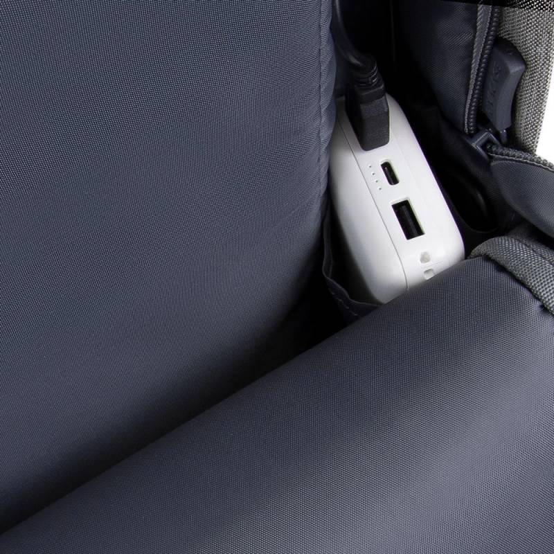 - Просторное основное отделение имеет карман на молнии для паспорта и бумажника и два кармана на дне рюкзака - один для мыши, второй для повербанка. На боковой стороне рюкзака имеется USB-порт для подключения портативного внешнего аккумулятора к смартфону.