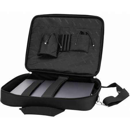 - Удобная сумка классического дизайна для ноутбуков с экраном 15,6 дюйма. В основном отделении предусмотрены съемная перегородка и специальный ремешок для плотной фиксации внутри. Также внутри есть несколько полезных отделений для принадлежностей и личных в