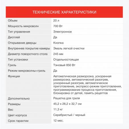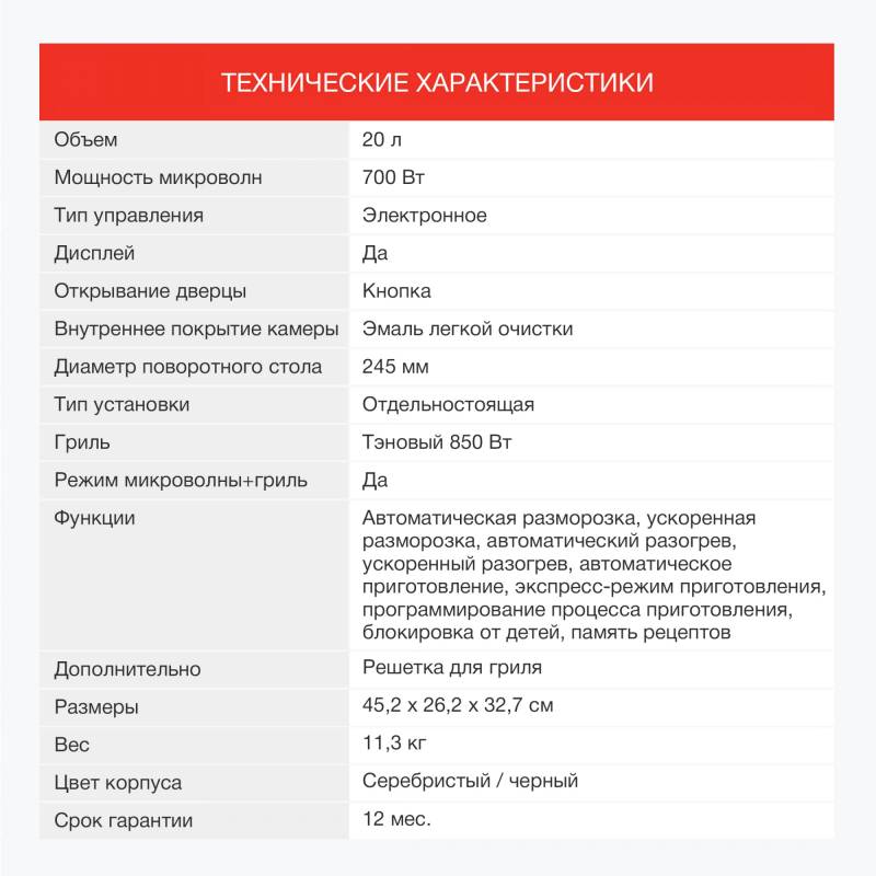 - размораживание по весу, режим микроволны+гриль, ускоренная разморозка, ускоренный разогрев, экспресс-режим приготовления