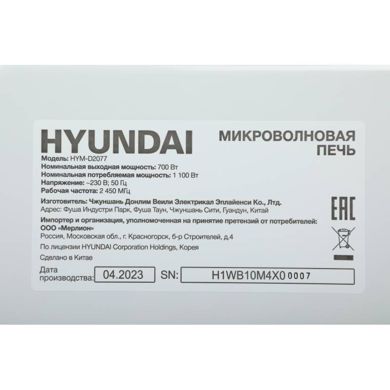 Микроволновая Печь Hyundai HYM-D2077 20л. 700Вт белый