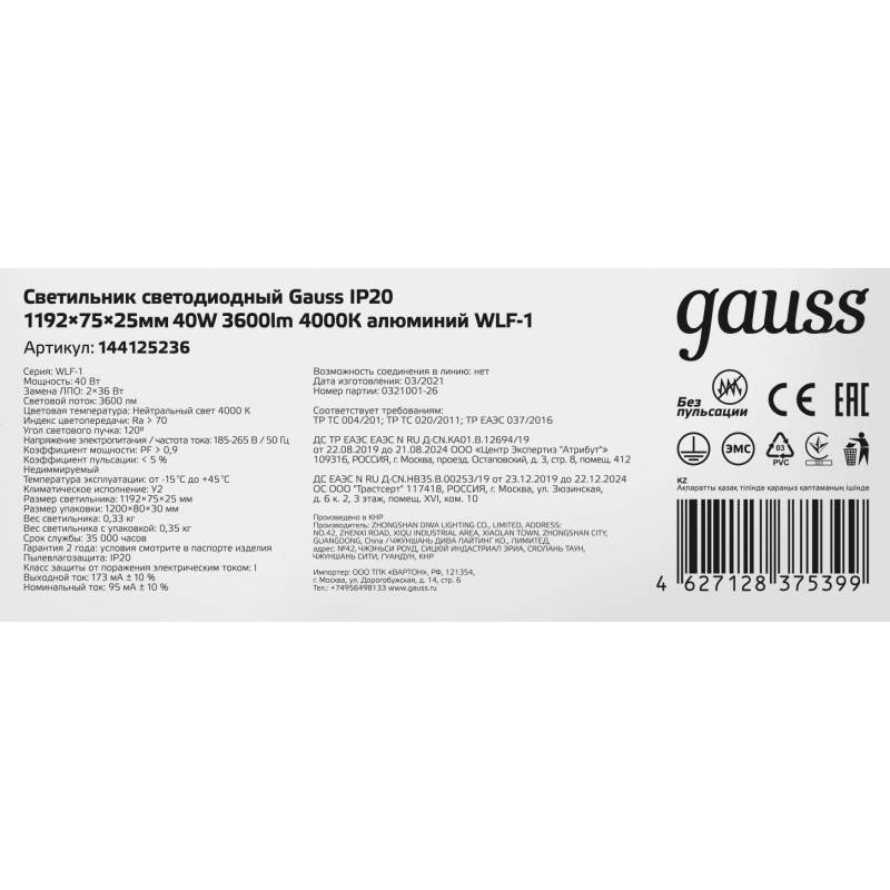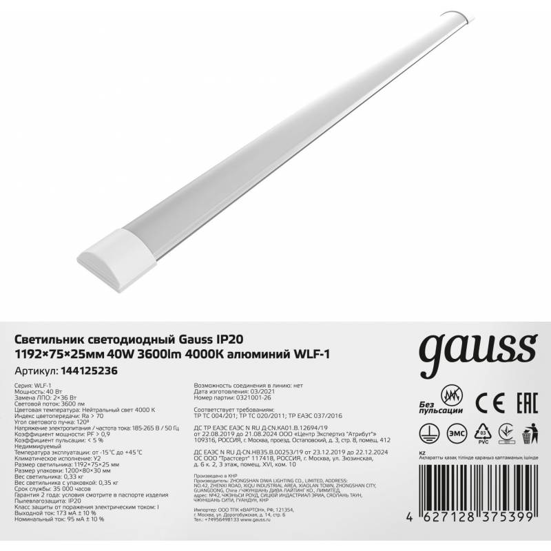 Светильник Gauss 144125236 40Вт 4000K