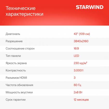 Телевизор LED Starwind 43" SW-LED43UG403 Яндекс.ТВ Frameless черный 4K Ultra HD 60Hz DVB-T DVB-T2 DVB-C DVB-S DVB-S2 USB WiFi Sm