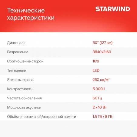 Телевизор LED Starwind 50" SW-LED50UG403 Яндекс.ТВ Frameless черный 4K Ultra HD 60Hz DVB-T DVB-T2 DVB-C DVB-S DVB-S2 USB WiFi Sm