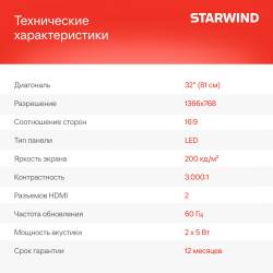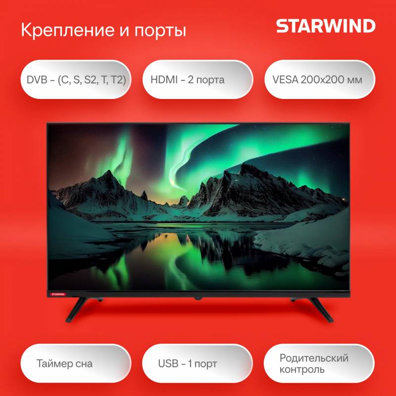 Телевизор LED Starwind 32" SW-LED32BG200 Frameless черный/черный HD 60Hz DVB-T DVB-T2 DVB-C DVB-S DVB-S2 USB