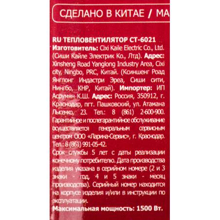 Тепловентилятор Centek CT-6021 1500Вт серый/черный