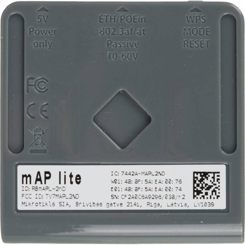 - Mikrotik mAP lite (RBmAPL-2nD) - новый компактный роутер от компании Mikrotik, оснащенный WiFi радиомодулем (работающий на частоте 2.4 ГГц (802.11b/g/n) и классическим Ethernet портом