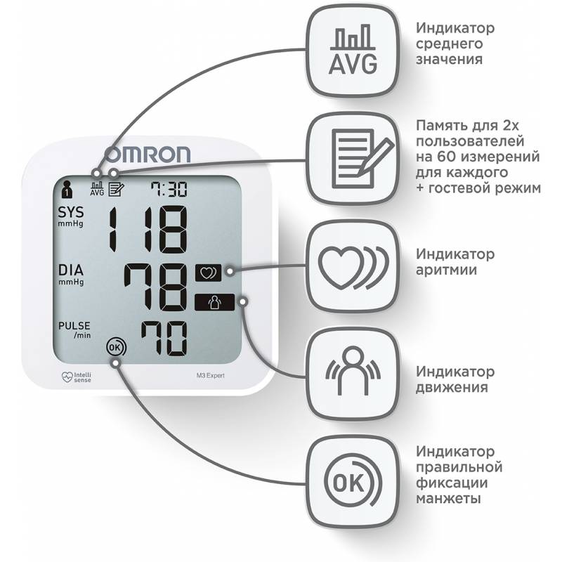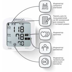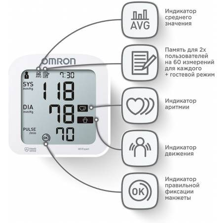 - Технология интеллектуального измерения Intellisense, Индикатор движения, Расчет среднего значения, Индикатор правильной фиксации манжеты, Графический индикатор уровня артериального давления, Память для 2 пользователей, OMRON connect, Клинически апробирова