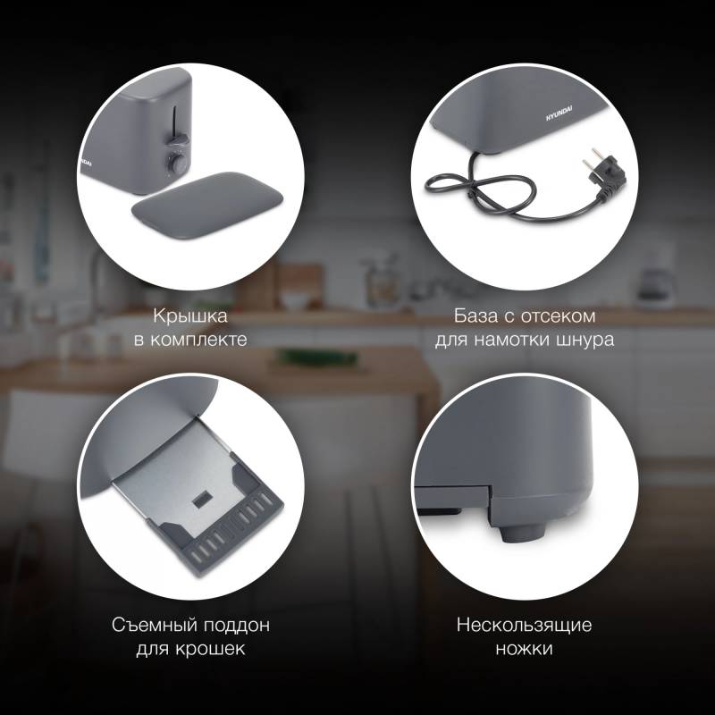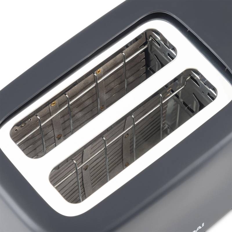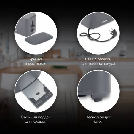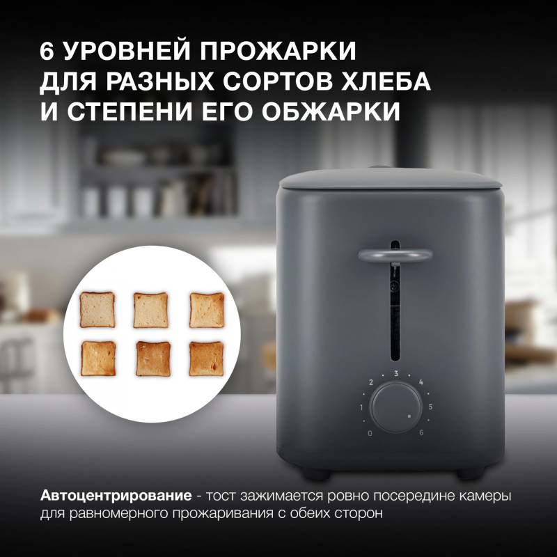 - Компактный тостер со стандартными слотами для двух тостов, торцевое управление, трендовый серый цвет. Только тостер, все что нужно.
