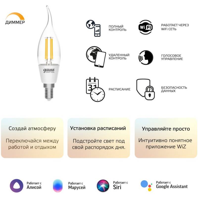 Умная лампа Gauss IoT Smart Home E14 4.5Вт 495lm Wi-Fi (упак.:1шт) (1260112)