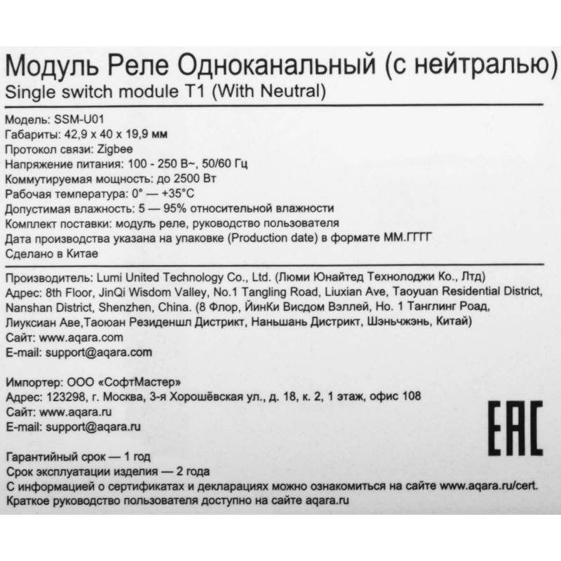 Умное реле Aqara T1 1канал. белый (SSM-U01)