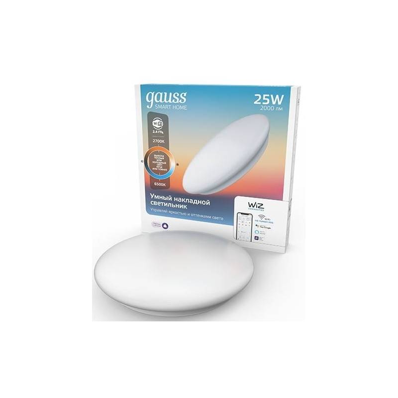 - Настенно-потолочные светильники используются там, где требуется качественный равномерный свет. В серии Gauss Smart Home представлены 2 светильника мощностью 25 Вт и 35 Вт с изменяемой цветовой температурой в диапазоне от 2700 К до 6500 К