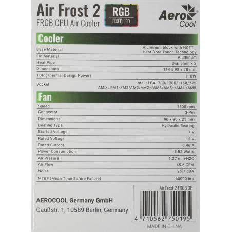 Устройство охлаждения(кулер) Aerocool Air Frost 2 RGB Soc-AM5/AM4/1200/1700/1851 черный/белый 3-pin 26dB Al+Cu 110W 250gr Ret (A