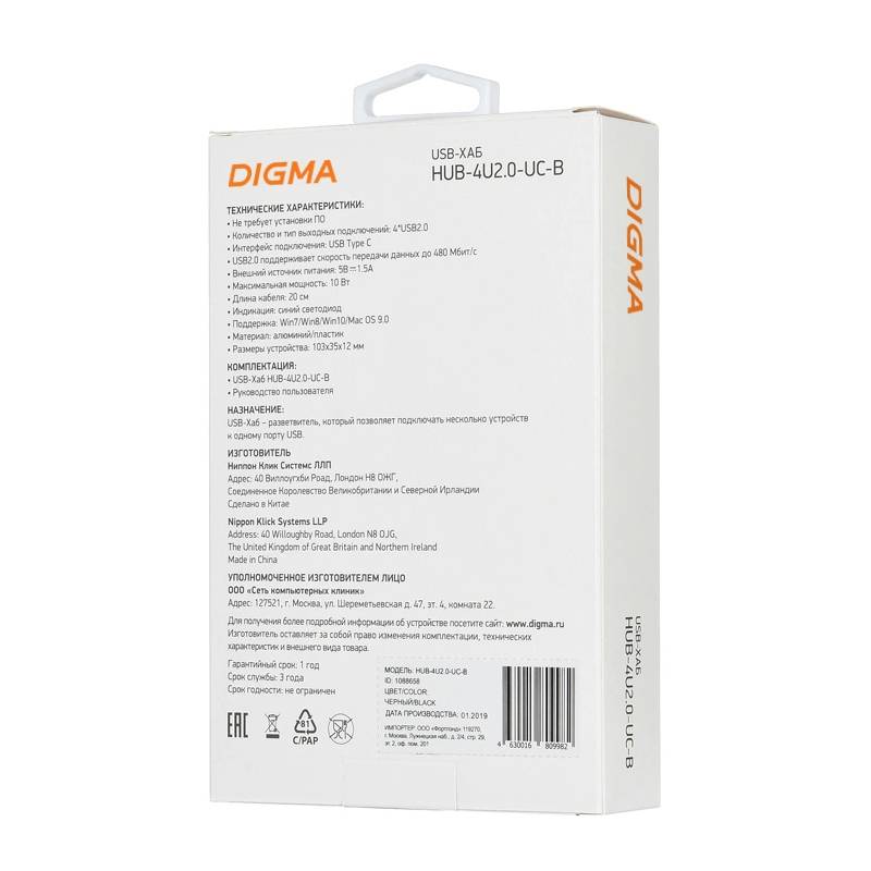 Разветвитель USB-C Digma HUB-4U2.0-UC-B 4порт. черный